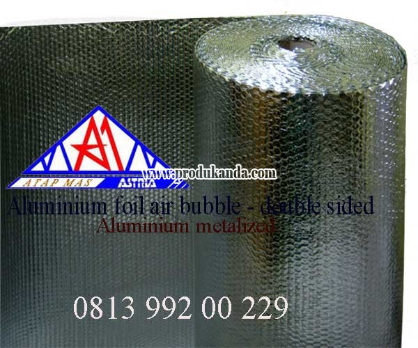 Aluminium Foil Air Cell Bubble - Double sided adalah aluminium foil yang paling reflektif memantulkan panas sampai dengan 97% dan emisivitas 3% dari radiasi panas matahari, panas yang diserap selanjutnya dikurangi oleh resistensi conductional dari struktur sel udara polimer, sehingga suhu ruang menjadi dingin dimusim panas dan hangat dimusim dingin.